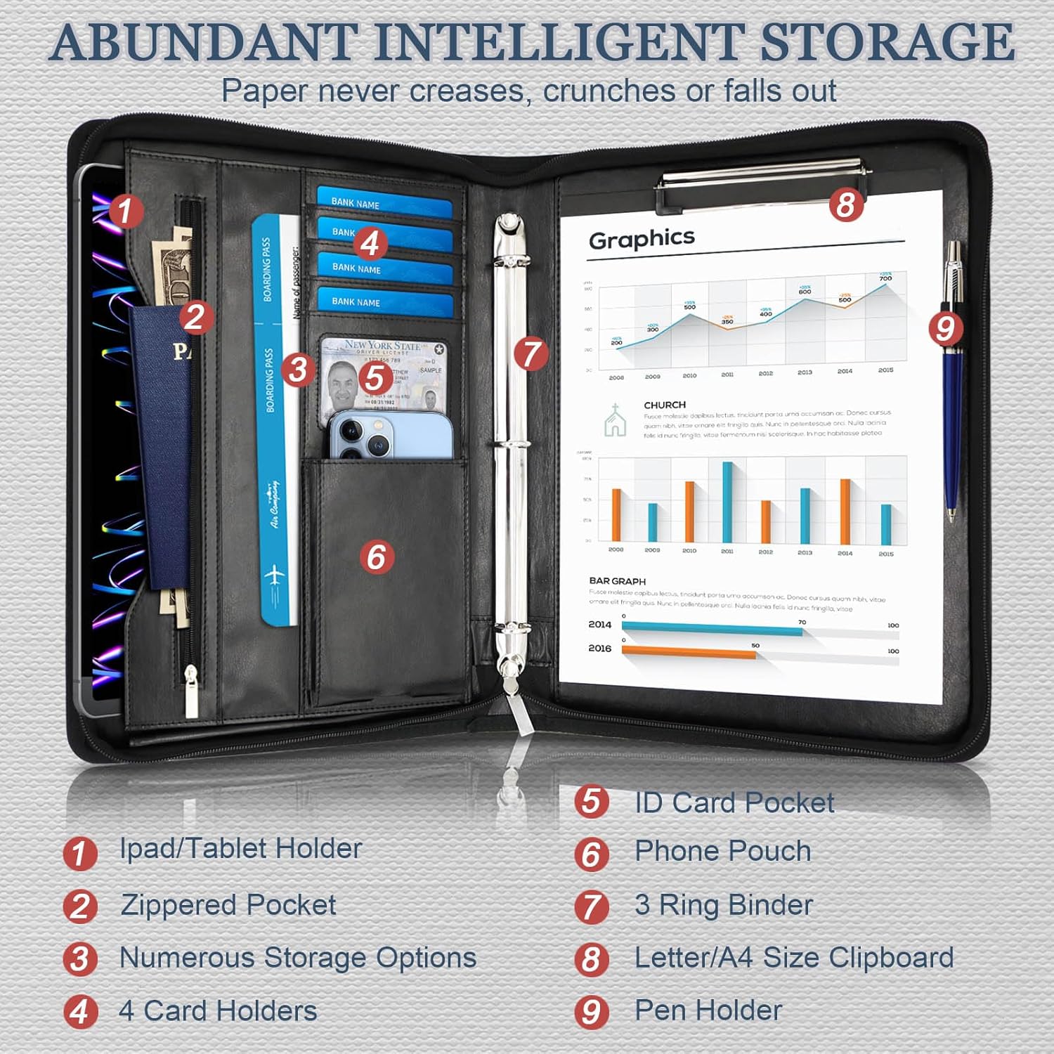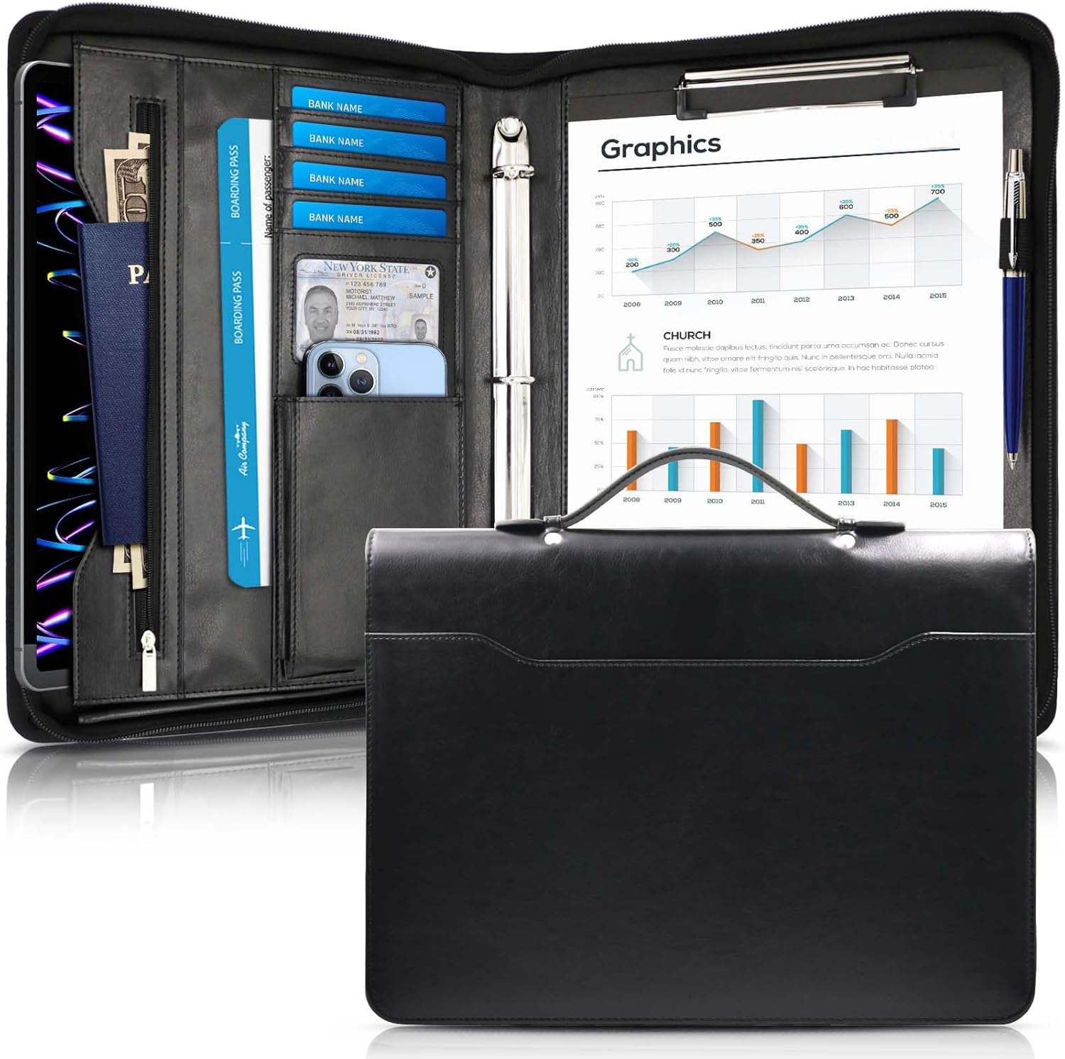 - 【Large Storage Space】IYGHV multifunctional leather portfolio features multiple compartments designed for storing resumes, files, cash, passports, tickets, and receipts. It includes three card slots and a transparent ID window for easy access to business cards. Additionally, a secure zippered compartment protects sensitive items, along with a phone pocket and a dedicated tablet section, catering to the needs of busy professionals.