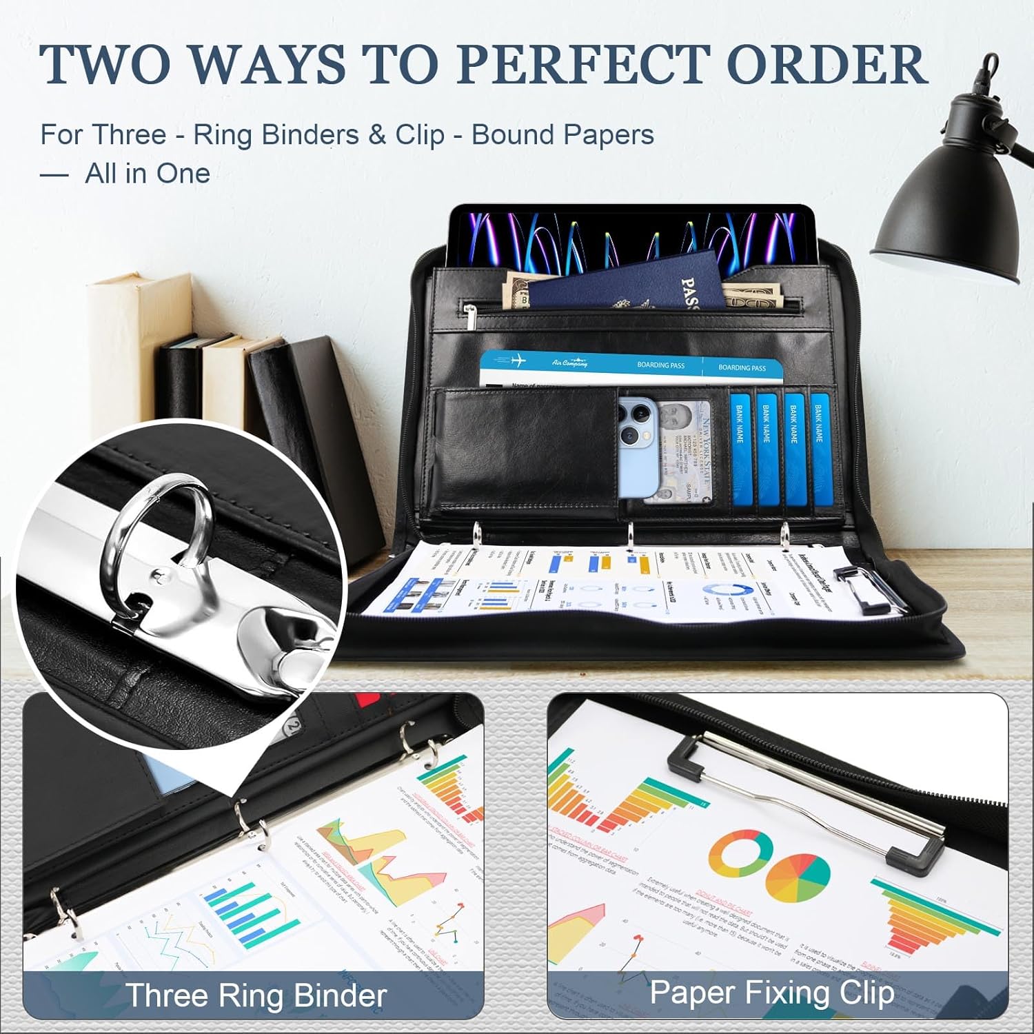 - 【Versatile & User-Friendly Design】: Equipped with a standard 3 ring binder, A4/ letter size clipboard and an elastic pen holder, our portfolio notebook ensures easy access to your office documents and writing tools. Its portable design makes it an ideal companion for lawyers, consultants, and business travelers, ensuring readiness in any setting.