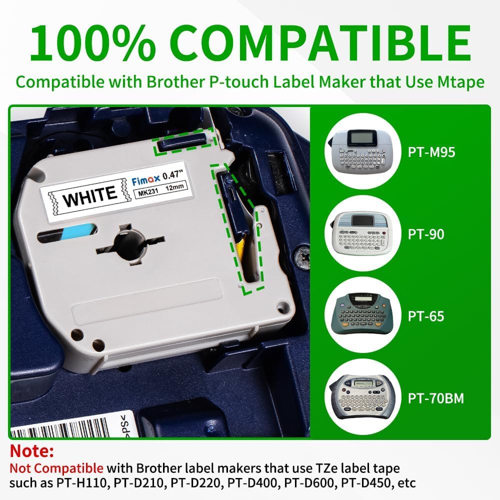 Fimax Replacement for Brother P Touch M Tape M231 MK231 MK-231 12mm 0.47 Inch to use with Brother PTouch PT-M95 PT-90 PT-70 PT-65 PT-85, Black on White, 26.2 Feet, 10-Pack