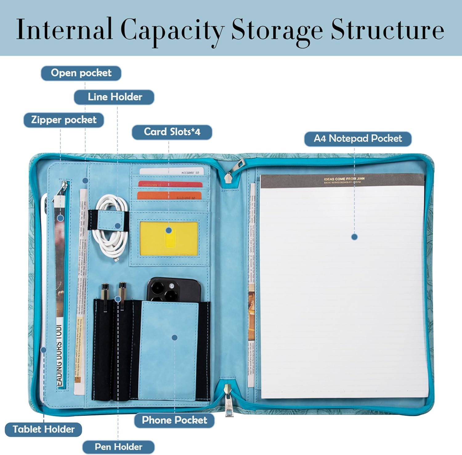 - 【Size & Functionality】Measuring 13.39 x 10.43 x 1.57 inches, this portfolio organizer has a spacious A4 pocket, a dedicated phone holder, 2 pen slots, a small receipt pocket, and a sturdy notebook holder. This design accommodates A4 papers, small notebooks, or even 12.9" iPad & MacBook, making it a versatile leather portfolio binder for any professional setting.
