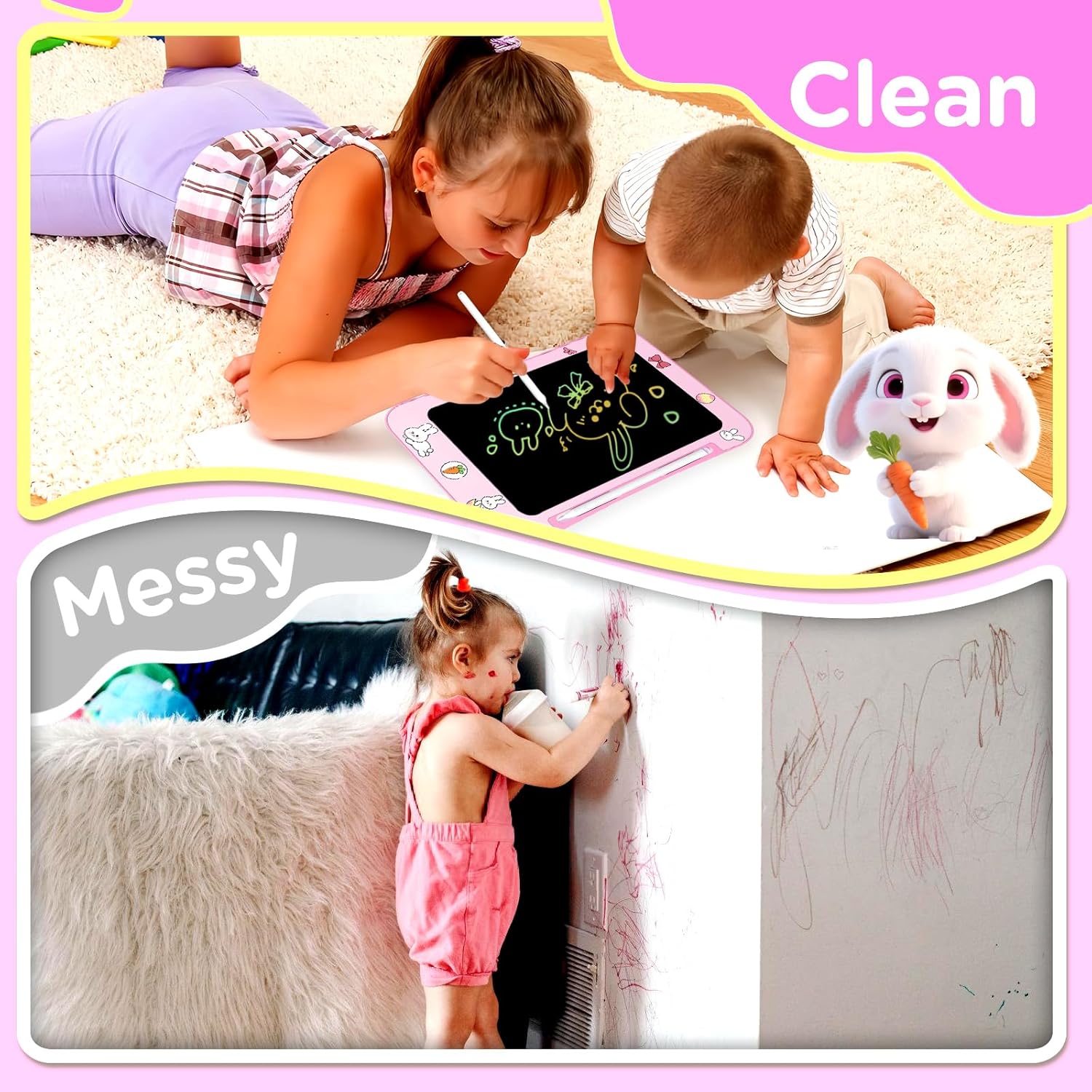 - ★ Cute Rabbit Teaching Toy for Children ★ The rabbit-themed LCD writing tablet with a colourful display provides enough space for drawing and doodling. Clear lines and vibrant colours unleash children's imagination and stimulate creativity. The bunny shape design makes learning and drawing more fun, while the LCD screen has no blue light, no glare, and no radiation—protecting children's eyes during long-time use.