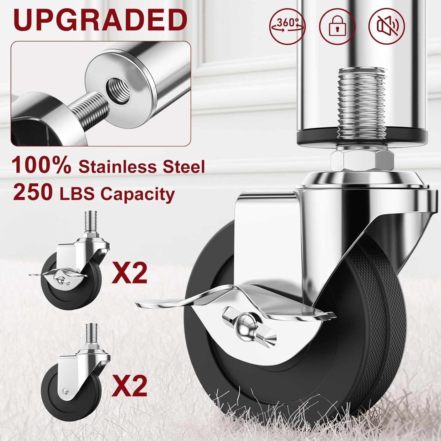 - SMOOTH-ROLLING 3" WHEELS WITH LOCKING BRAKES! Thanks to enlarged and thickened wheels, our commercial clothes rack can glide smoothly on uneven floors even fully loaded. Two lockable casters keep the clothing racks for hanging clothes securely in place. The clothing rack with wheels will not make noise or scratch the floor when moving. Ideal for drying laundry, organizing guest coat, expanding closet storage, or displaying clothes, shoes, belts, bags in stores with ease.