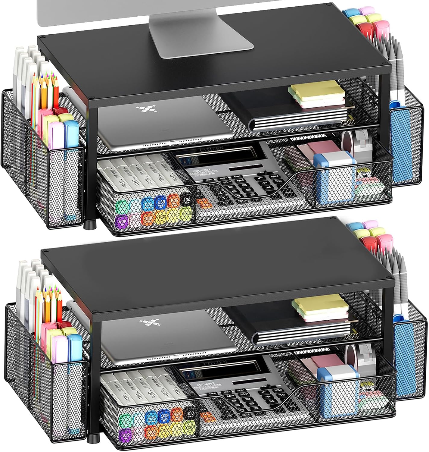 - ăSave SpaceăďźThis 2-Tier monitor stand with drawer and 2 hanging pen holders provides ample storage space to keep your office supplies and office desk accessories neatly organized and easily accessible, keeping your workspace tidy and improving your sense of well-being