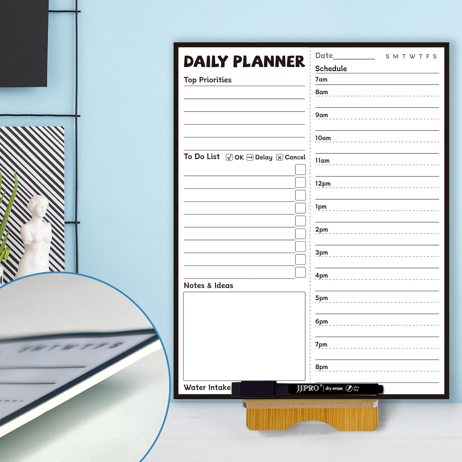 - Easy to Write & Erase: The smooth,dry erase surface of the hourly planner works seamlessly with the black marker, allowing for quick, clean writing and erasing without residue