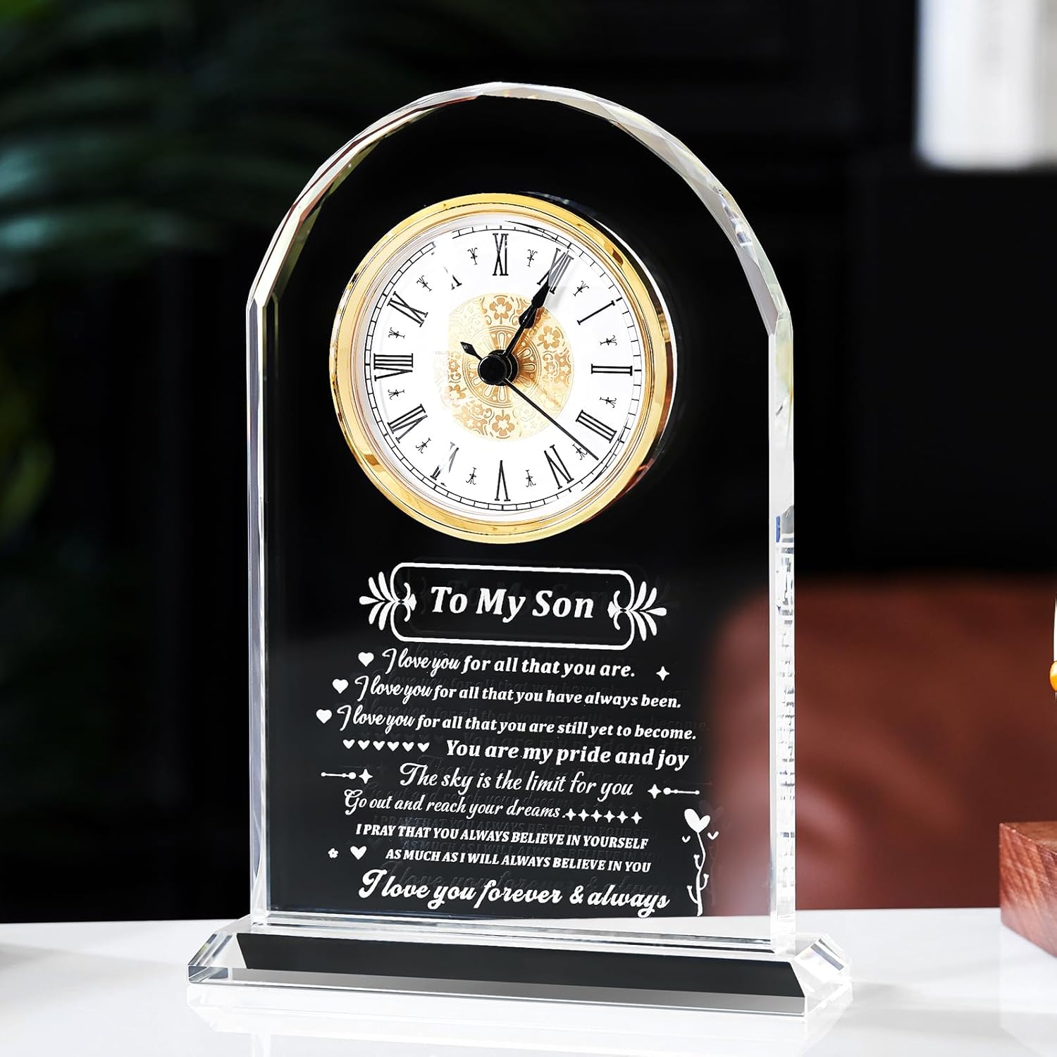 - Son Gift:This is a unique Son gift of a crystal glass clock, engraved with many phrases that carry beautiful meanings. It is the perfect gift to give to Son.