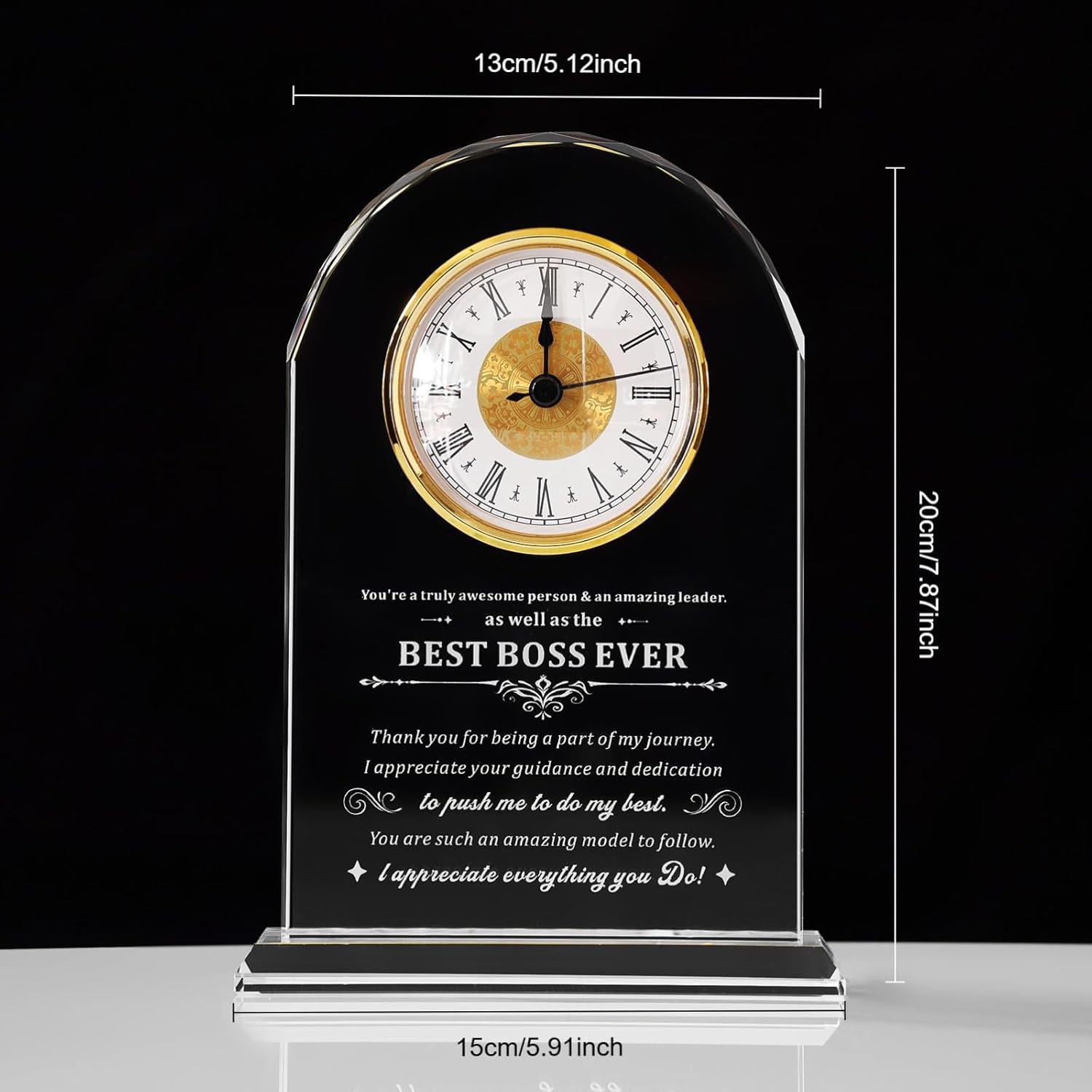- Boss Gift:This is a unique Boss gift of a crystal glass clock, engraved with many phrases that carry beautiful meanings. It is the perfect gift to give to Boss.