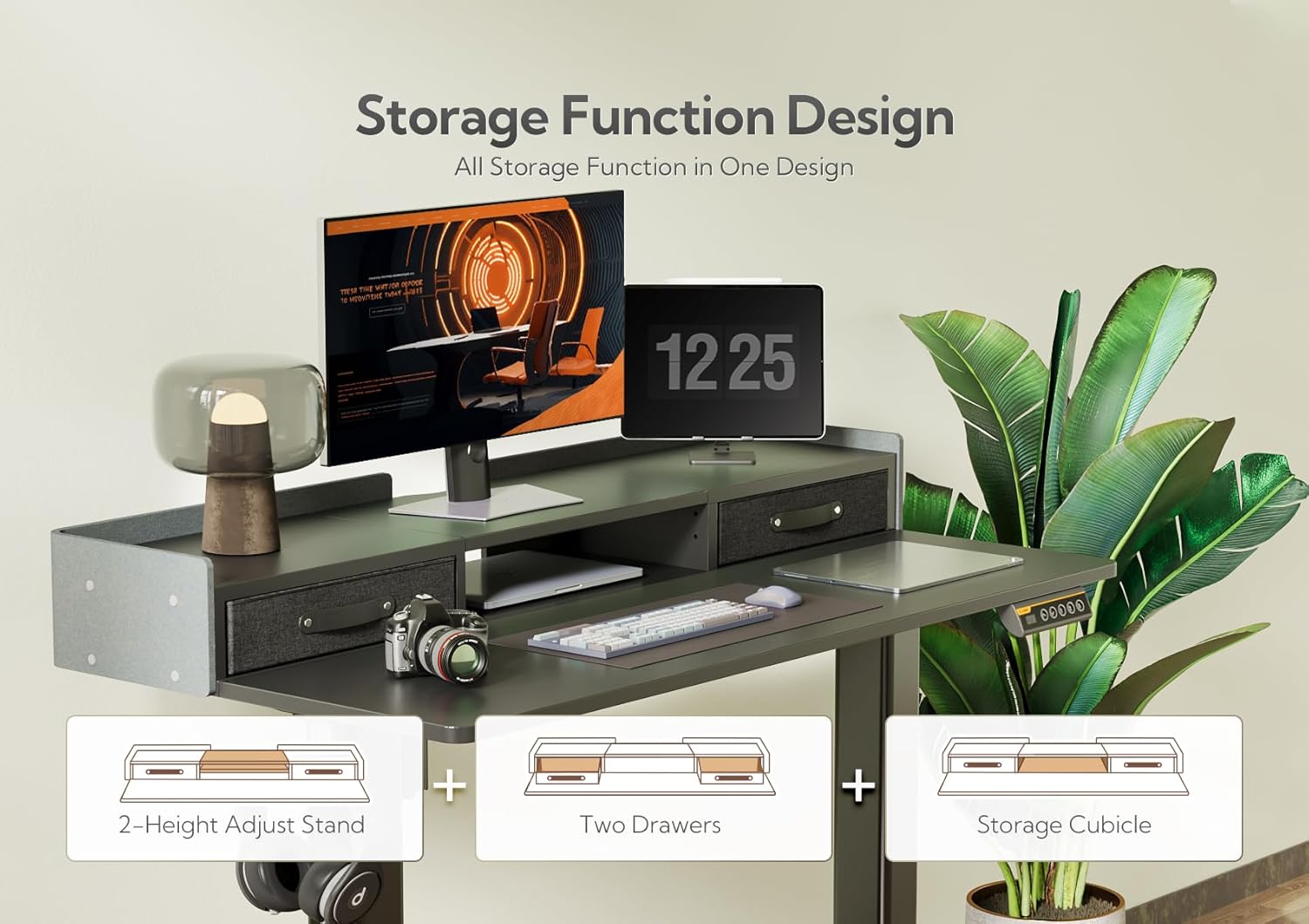 - 2-Drawers for Storage - Adjustable stand desk with drawers. 2 tabletop drawers provide more storage & organize space for a variety of home office tasks. The desk comes with a hook, drawers, and felt fence, which provides more home office desk usage possibilities.