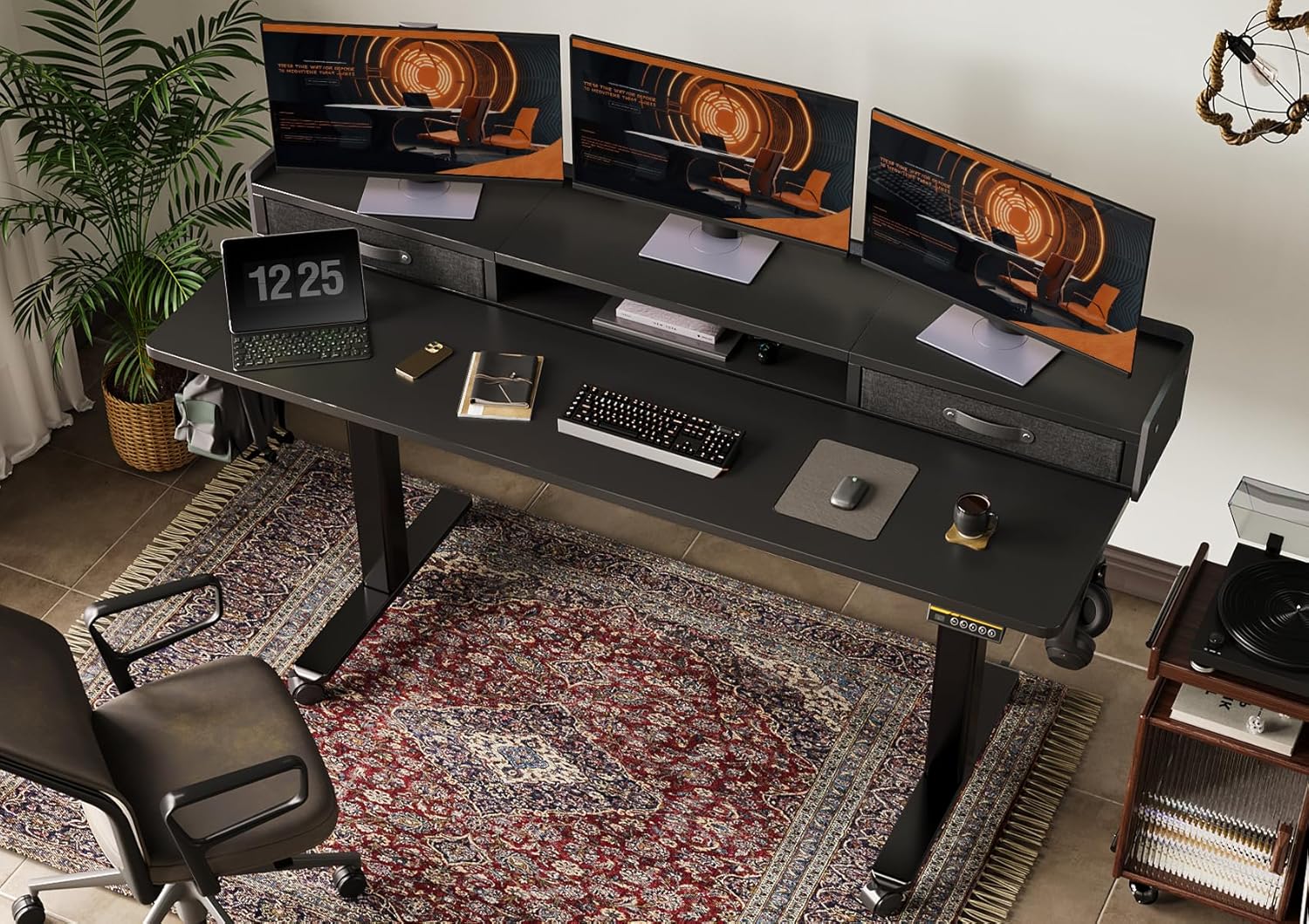 YDN Standing Desk with Drawers, 63 Inch Standing Desk Adjustable Height, Adjustable Electric Stand Up Sit Stand Small with Storage and Shelf, Black